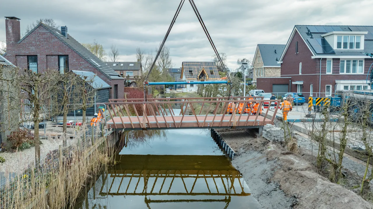 Op de projectlocatie in Schalkwijk werden tweedehands stalen buispalen de grond ingeslagen als fundering. Ook een hardhouten damwand was ‘tweedehands’: eveneens geoogst uit bruggen uit Purmerend. Het nieuwe brugdek was klaar om geplaatst te worden!