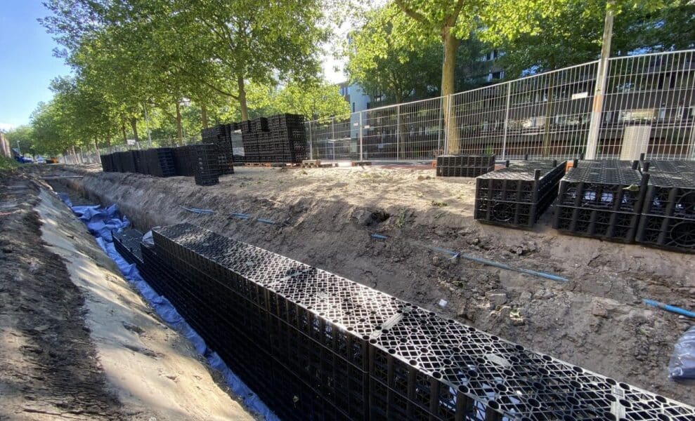 Om in zowel tijden van overlast als droogte het hemelwater beter te kunnen beheersen, zijn er drie proefvakken in de groenstrook ingericht met een Permavoid vloer. Via de Tegra waterkolken van Wavin wordt het eerste grove vuil uit het hemelwater gefilterd. Vervolgens komt dit water samen in de Orifice kolk van Wavin; deze voert de eerste ‘vervuilde’ flush af naar het riool. Het schone water wordt opgeslagen in de Permavoid vloer. In perioden van langdurige droogte kan dit water naar de oppervlakte worden gebracht om zo de bomen en het andere groen van water te voorzien.