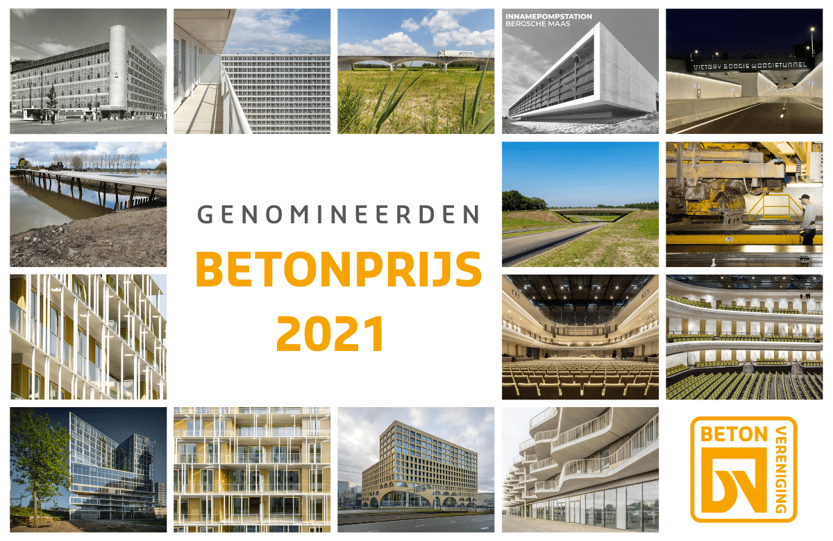 Gouda, 3 november 2021 | Voor de Betonprijs 2021 zijn door de vakkundige jury over de 6 categorieën in totaal 15 projecten genomineerd die kans maken op het winnen van deze prestigieuze prijs. Eén van deze genomineerden maakt tevens kans op de Toekomstprijs. Uitreiking van de Betonprijs vindt live plaats op donderdag 18 november tijdens het Beton Event in de Van Nelle Fabriek te Rotterdam.