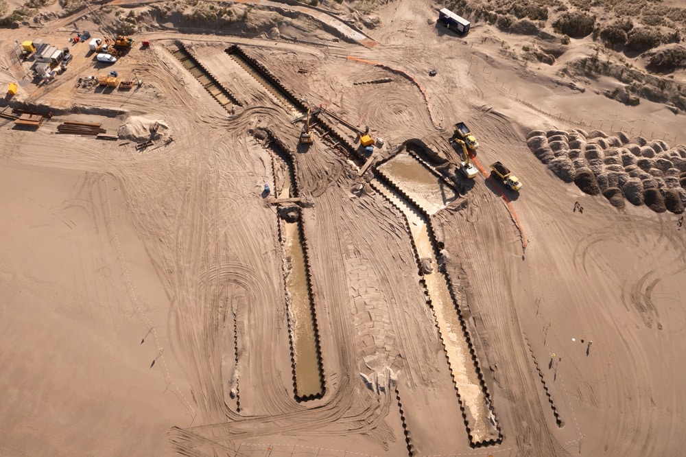 Na de twee succesvolle boringen onder de duinen door, liggen de mantelbuizen voor de elektriciteitskabels al op hun plek. Vanaf zee wordt de eerste kabel vanaf het installatieponton Giant 7 naar het strand gebracht. Daarvoor staat op het werkterrein op het strand al een 200 tons lier die behalve de kabel ook de kabelbegraafmachine naar het strand trekt.