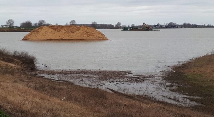 De zandwinput Over de Maas bij Alphen, waar het granietverwerkende bedrijf Bontrup met toestemming van Rijkswaterstaat granuliet mag storten | Foto: Jac van Tuijn