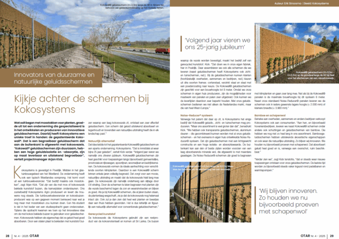 Wat ooit begon met mosstokken voor planten, groeide uit tot een onderneming die gespecialiseerd is in het ontwikkelen en produceren van innovatieve geluidsschermen. Daarbij heeft Kokosystems een unieke troef in handen: de gepatenteerde Kokowall®. Dat is een begroeibaar geluidsscherm dat aan de buitenkant is afgewerkt met kokosvezels. “Kokowall® geluidsschermen zijn duurzaam, hebben een hoge geluidsisolatie en -absorptie, zijn op maat leverbaar en uitstekend begroeibaar”, vertelt projectmanager Arjan Kick.