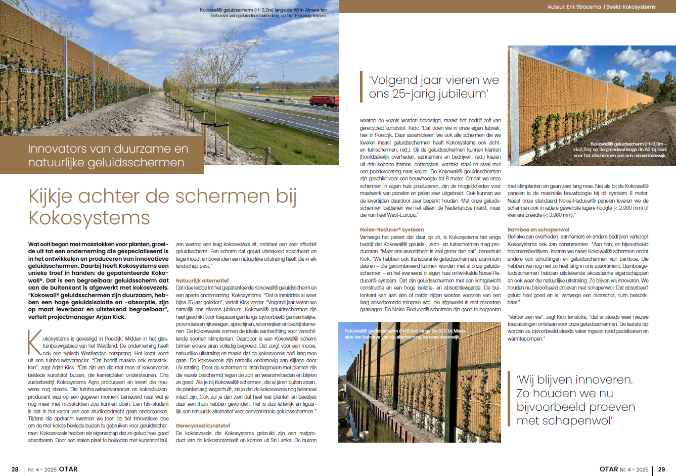 Dat idee leidde tot het gepatenteerde Kokowall® geluidsscherm en een aparte onderneming: Kokosystems. “Dat is inmiddels al weer bijna 25 jaar geleden”, vertelt Kick verder. “Volgend jaar vieren we namelijk ons zilveren jubileum. Kokowall® geluidsschermen zijn heel geschikt voor toepassingen langs bijvoorbeeld gemeentelijke, provinciale en rijkswegen, spoorlijnen, woonwijken en bedrijfsterreinen. De kokosvezels vormen de ideale aanhechting voor verschillende soorten klimplanten. Daardoor is een Kokowall® scherm binnen enkele jaren volledig begroeid. Dat zorgt voor een mooie, natuurlijke uitstraling en maakt dat de kokosvezels héél lang mee gaan. De kokosvezels zijn namelijk onderhevig aan slijtage door UV-straling. Door de schermen te laten begroeien met planten zijn die vezels beschermd tegen de zon en weersinvloeden en blijven ze goed. Als je bij Kokowall® schermen, die al járen buiten staan, de plantenlaag wegschuift, zie je dat de kokosvezels nog helemaal intact zijn. Ook zul je dan zien dat heel wat planten en beestjes daar een thuis hebben gevonden. Het is dus letterlijk en figuurlijk een natuurlijk alternatief voor conventionele geluidsschermen.”