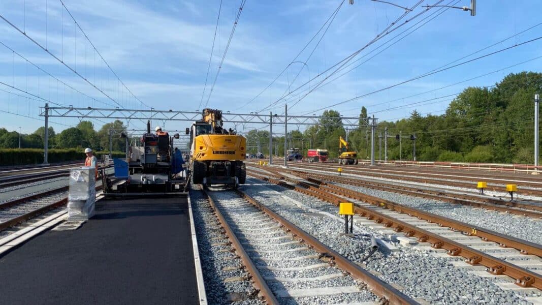 Het aanbrengen van het asfalt op de dienstwegen en serviceperrons was voor KWS één van de huzarenstukjes van het project Spooruitbreiding Zwolle-Herfte (foto: KWS).