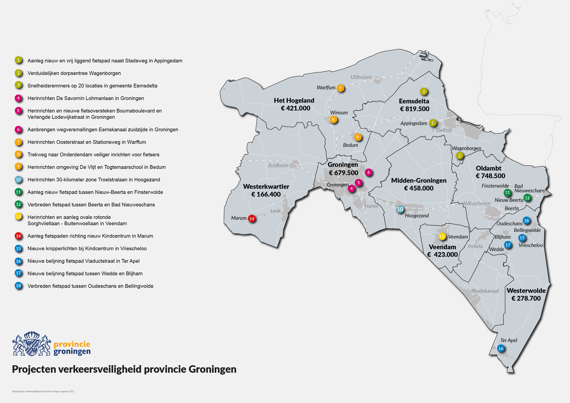 De 18 projecten worden verspreid over de provincie uitgevoerd. Zo komen er een nieuwe fietspaden in Appingedam en tussen Beerta en Finsterwolde. In Warffum en Hoogezand worden 30-kilometerzones ingericht. In Bedum en Marum is aandacht voor de verkeersveiligheid rondom een school en kinderdagverblijf.