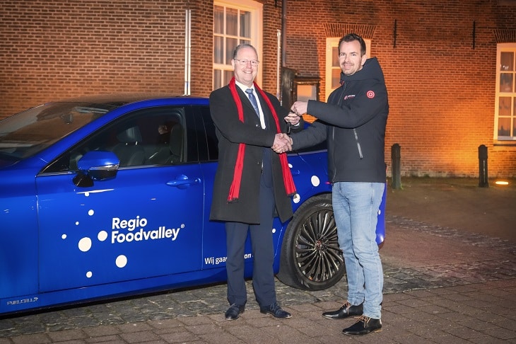 Na afloop van de bijeenkomst ‘Werkplaats Waterstof: Innovatie & Businesscases’ nam wethouder Engbert Stroobosscher (Veenendaal), bestuurlijk verantwoordelijk voor Mobiliteit in Regio Foodvalley, de sleutel van de Toyota Mirai in ontvangst. Toyota dealer Van Gent uit Ede presenteerde na de bijeenkomst deze schone en duurzame waterstofauto. Deze waterstofauto sluit als ‘gebruiker’ van waterstof perfect aan bij de inzet van de Regio Foodvalley om waterstof van opwek tot aan het gebruik voor verschillende doeleinden te stimuleren.