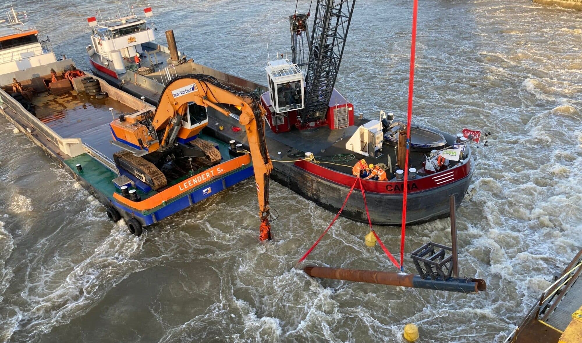 Die constructie van buizen is op 12 februari aan wal gemonteerd en vervolgens benedenstrooms tegen de drie jukken geplaatst. Daarmee zijn de jukken verstevigd en ook stabiel. Vooruitlopend op deze reparatie was er ballast op de jukken geplaatst om deze te verstevigen en is er een continue meting op de jukken gezet om ze te monitoren. De beschadigde jukken zijn een aantal millimeter naar achteren uitgezet. “Een kleine uitzetting weliswaar, maar meer dan de veiligheidsnorm”, stelt Rijkswaterstaat.